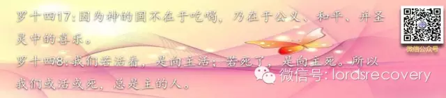 罗马十四章十七节是很好的一节。这节说,‘神的国不在于吃喝,乃在于公义、和平、并圣灵中的喜乐。’换句话说,国度完全是在灵里的生活。在那灵里的生活就是国度,而这国度就是召会生活的实际。